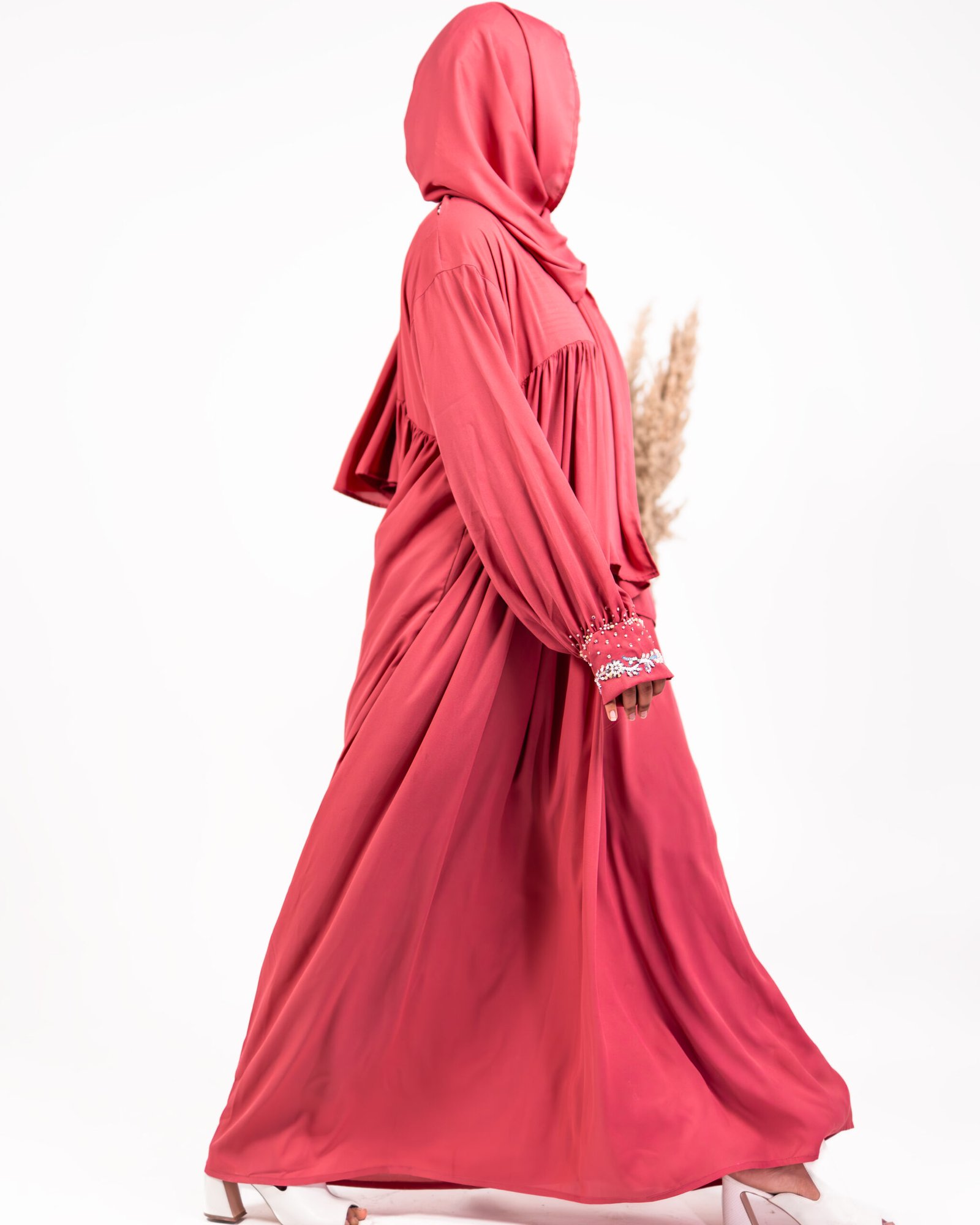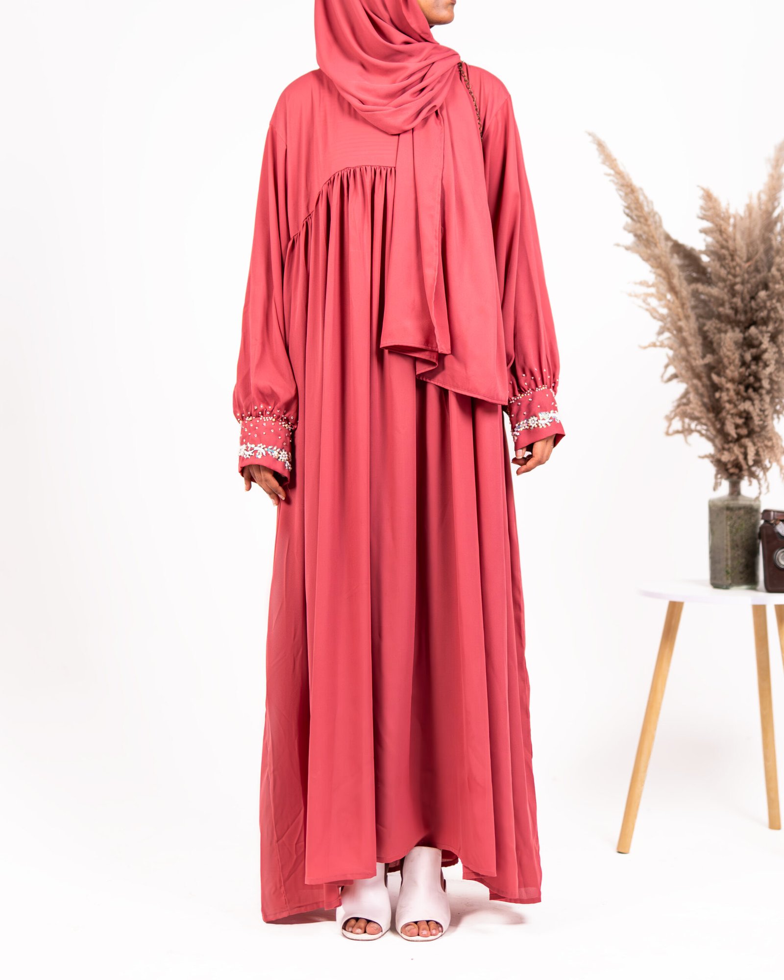 Zahra – A beautiful frock-style abaya in a soft blush pink shade, exuding elegance and femininity. Crafted from premium Georgette fabric, it features delicately embroidered sleeves adorned with pearls and beads. A perfect choice for festive occasions and special events.