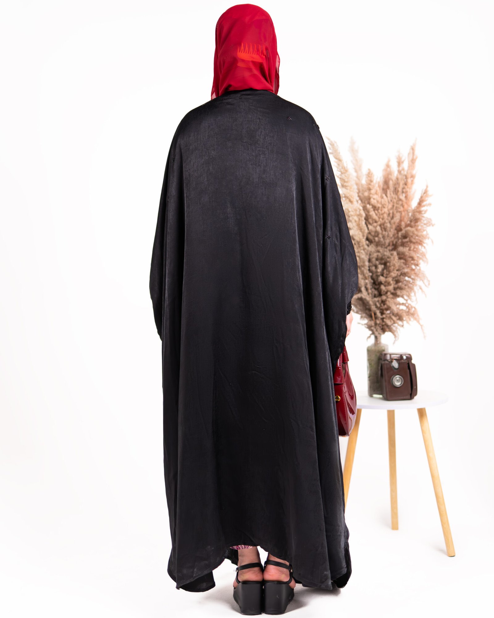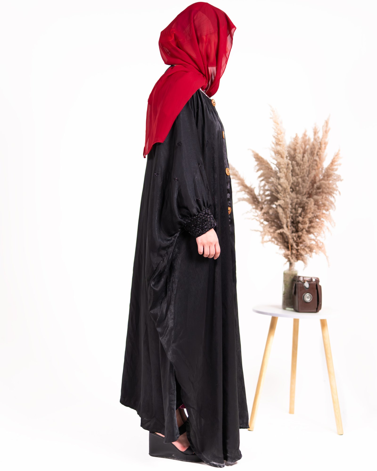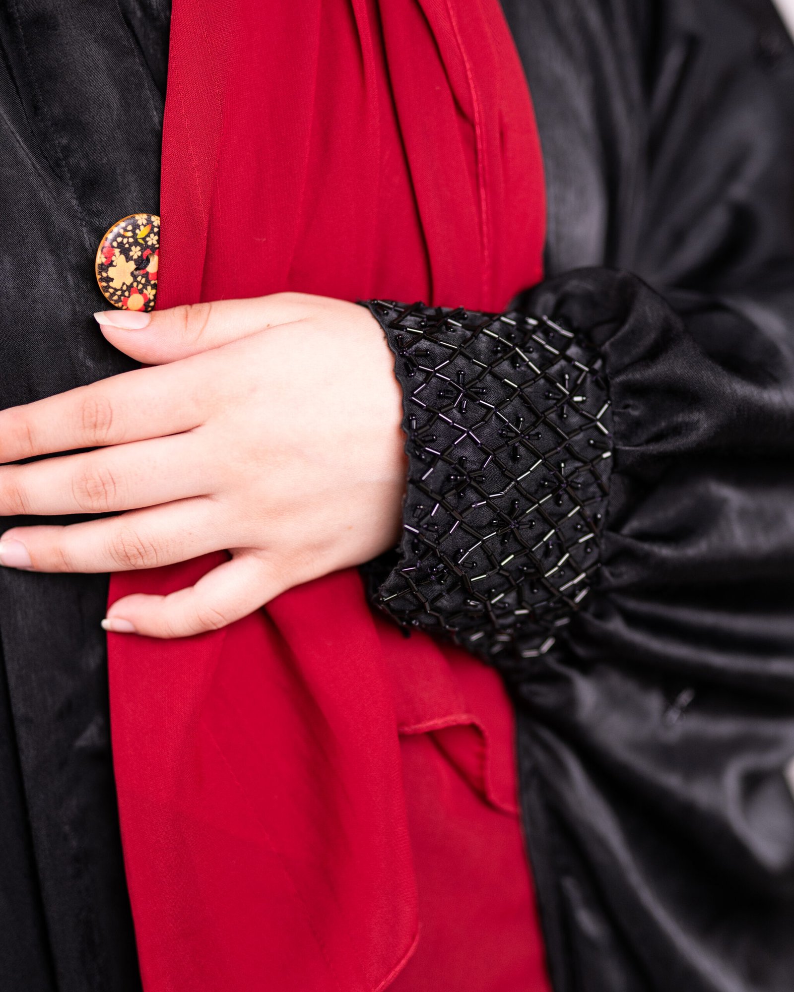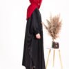 Zaina – A timeless butterfly-style abaya in classic black, crafted from soft and flowy Nida fabric. The design features modern-style front buttons and sleeves adorned with elegant black beads, blending tradition with a contemporary touch. A versatile piece perfect for both formal and special occasions.